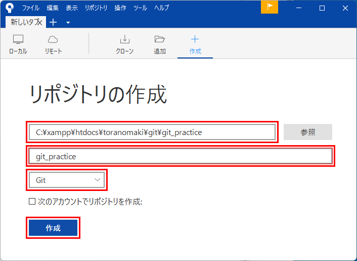 「リポジトリ名」:ここには自動的に今設定したフォルダの名前がはいります