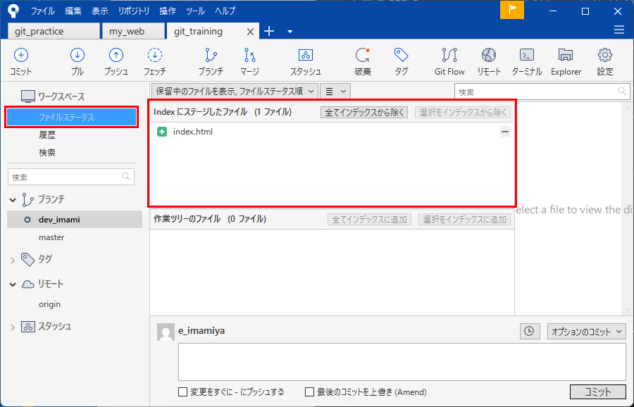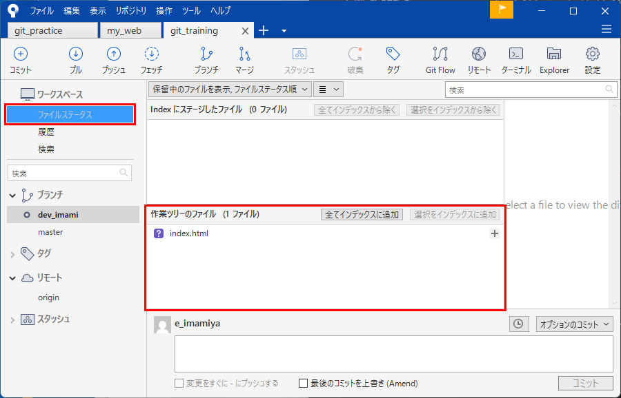「全てインデックスに追加」ボタンをクリックすると、画面の上の「indexにステージしたファイル」に移動します