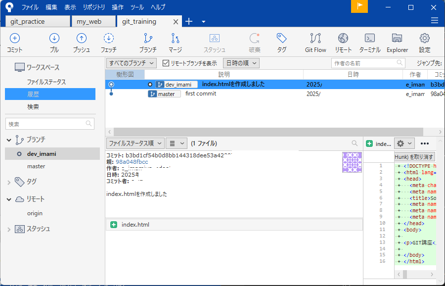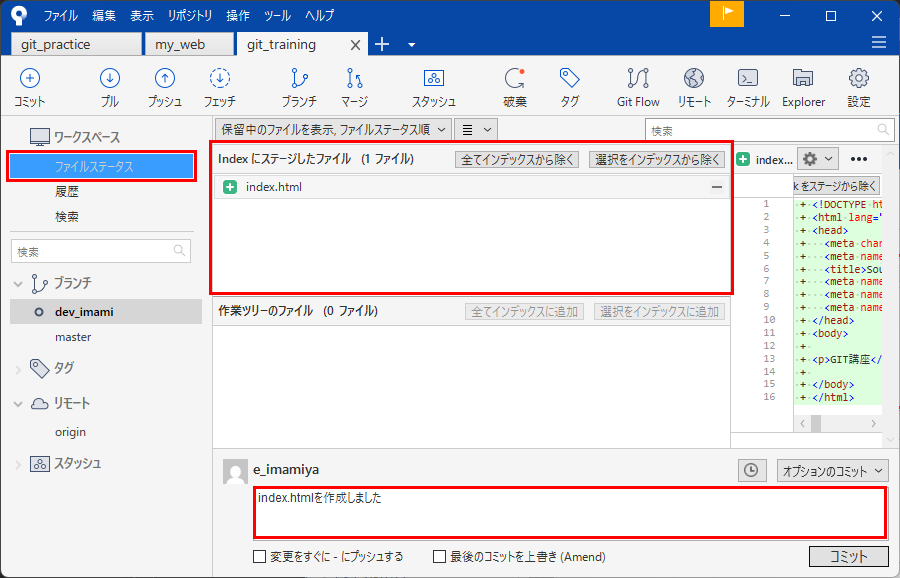 上のところに「index.htmlを作成しました」と、今入力したコメントが表示されています。
