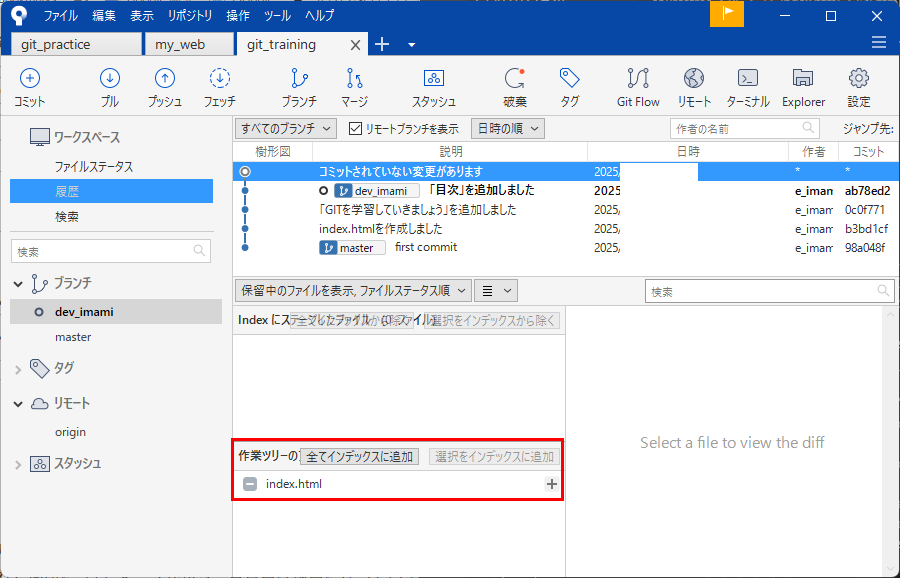 その代わり、コミットしてない状態に戻す戻るので「コミットされていない変更があります」になり、「作業ツリーのファイル」の方に「index.html」がいます。