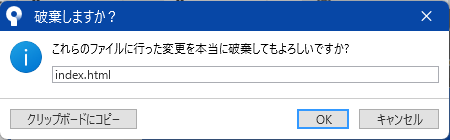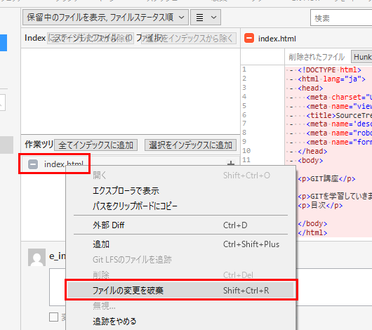 「作業ツリーにあるファイル」にある「index.html」を右クリックして「ファイルの変更を破棄」を選択する