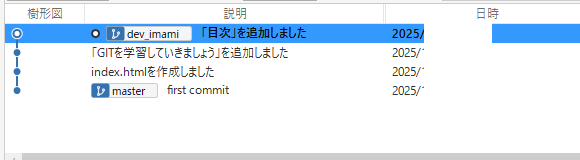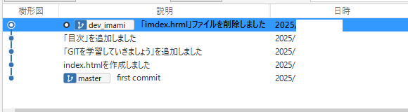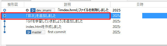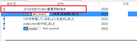すると、「index.htmlファイルを削除しました」のコミットが消え、「コミットされていない変更があります」に変わりました。
