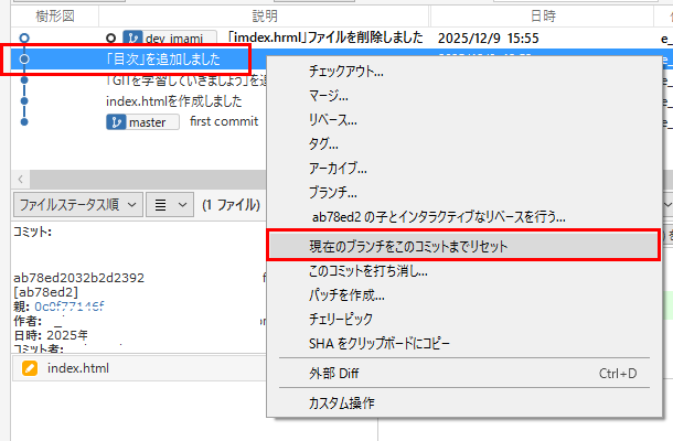 そして、右クリックして、「現在のブランチをこのコミットまでリセット」というこちらのメニューをクリックしていきます。