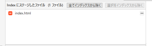 その代わり、コミットしてない状態に戻す戻るので「コミットされていない変更があります」になり、「Indexにステージしたファイル」に「index.html」がいます。